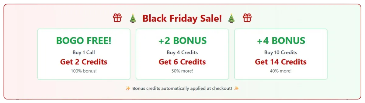1 credit = 1 call. Credits never expire. Credits automatically added to your account. Purchase more credits in app.